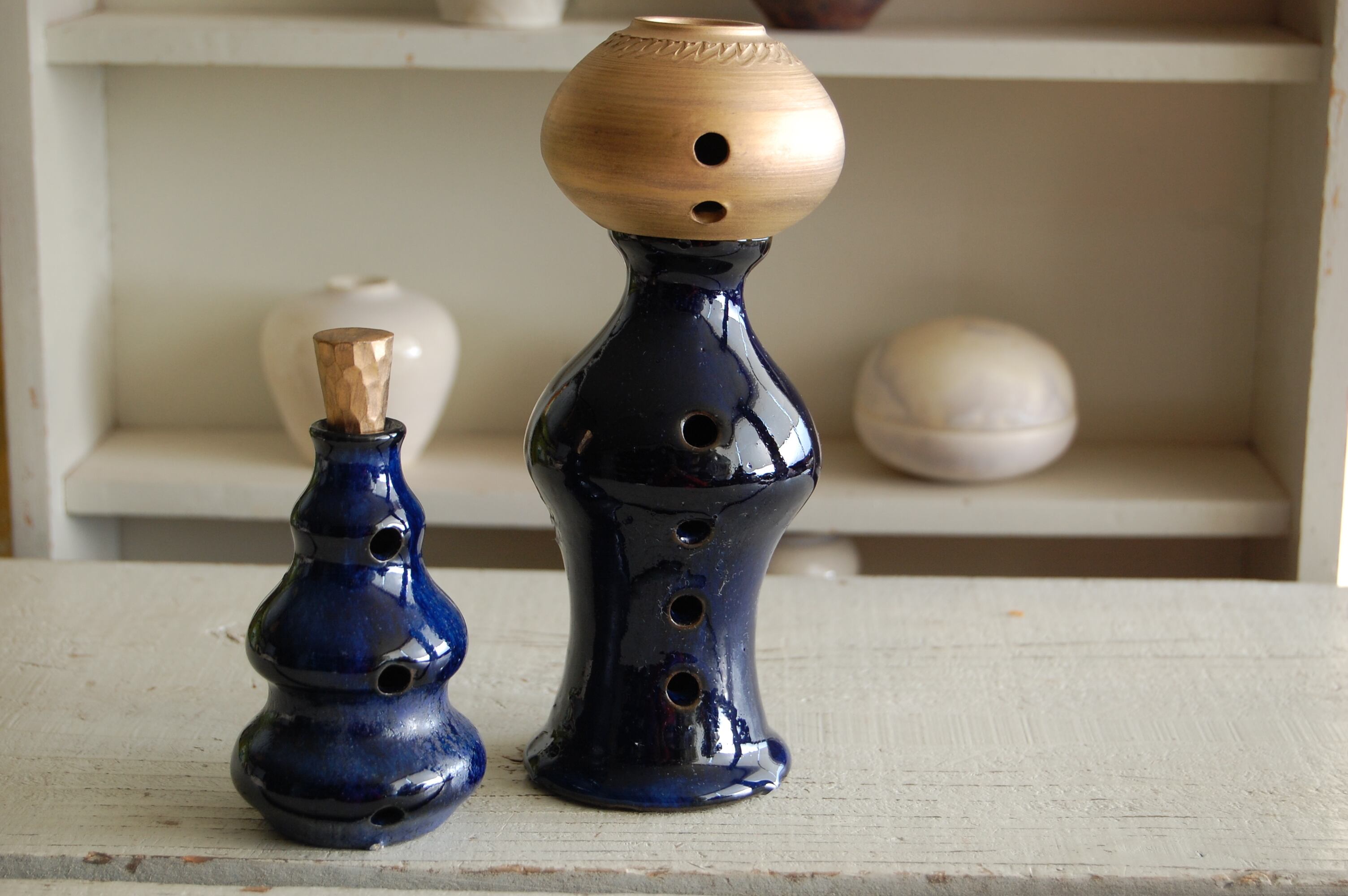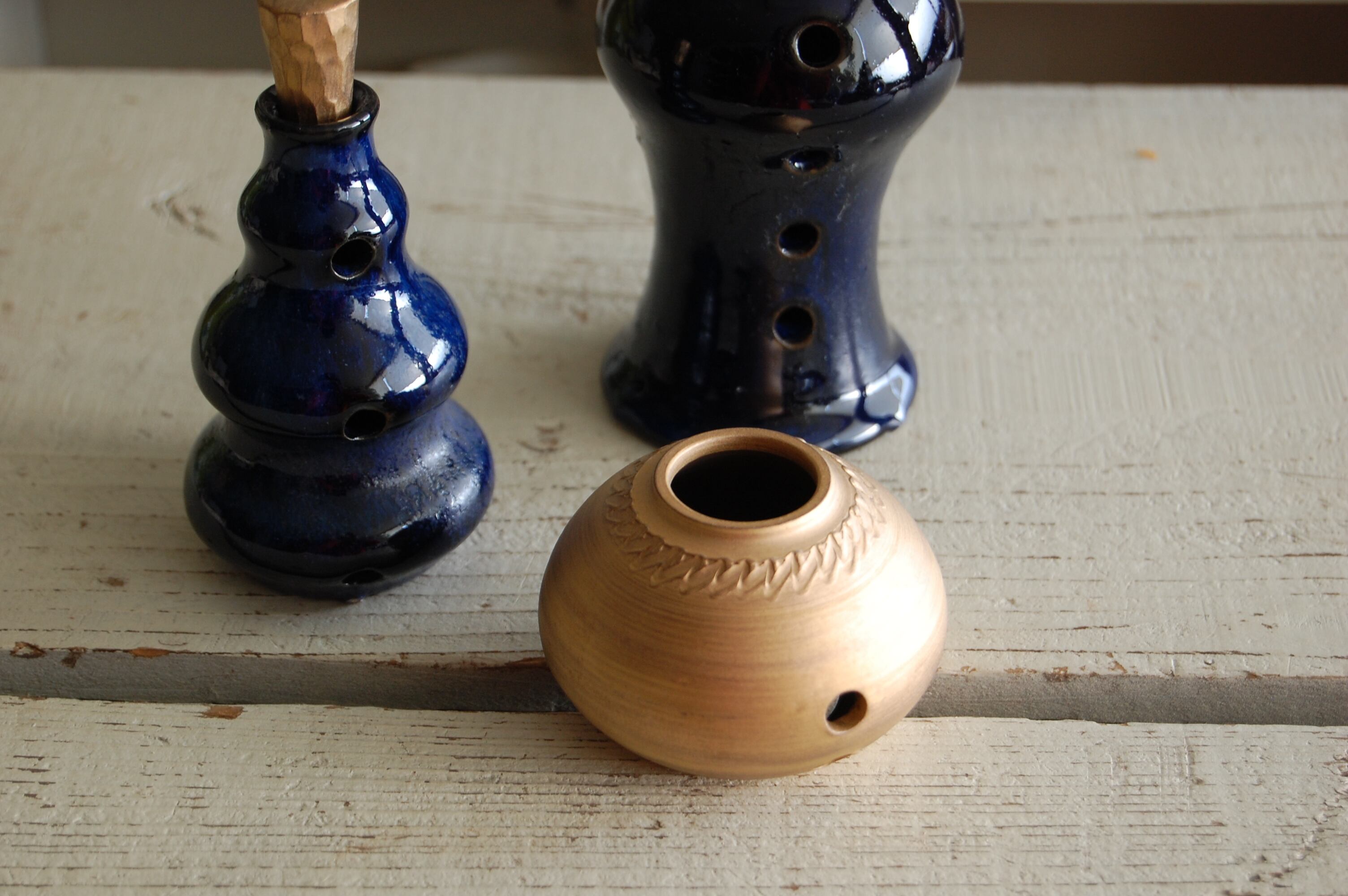 焼くと青く発色する、コバルト鉱石を用いた、オリジナルの瑠璃釉が光る、3体組み立て式のお香立てです。煙が沈下して、穴から流れて香りを引き立てる演出をしてくれます。