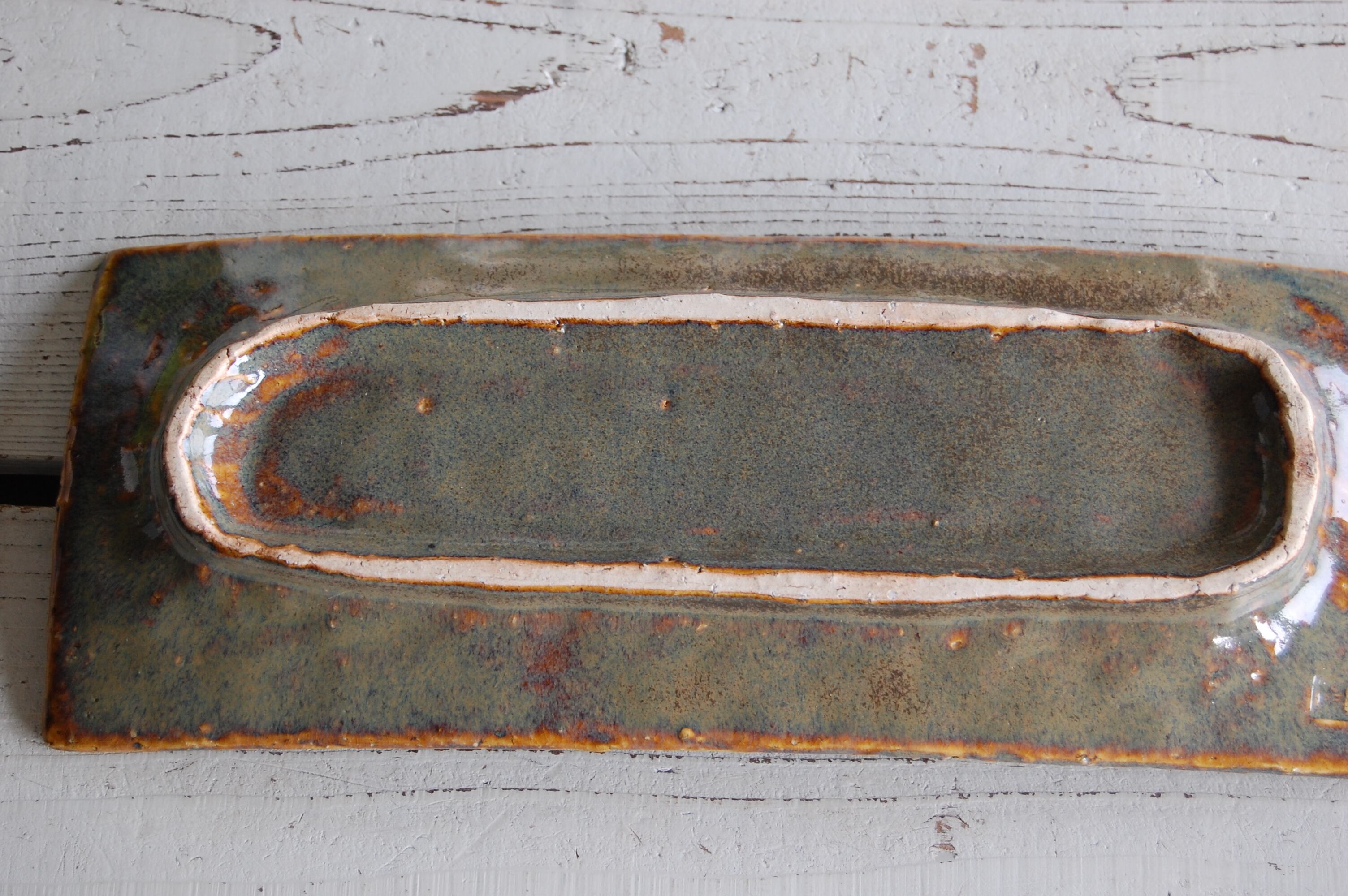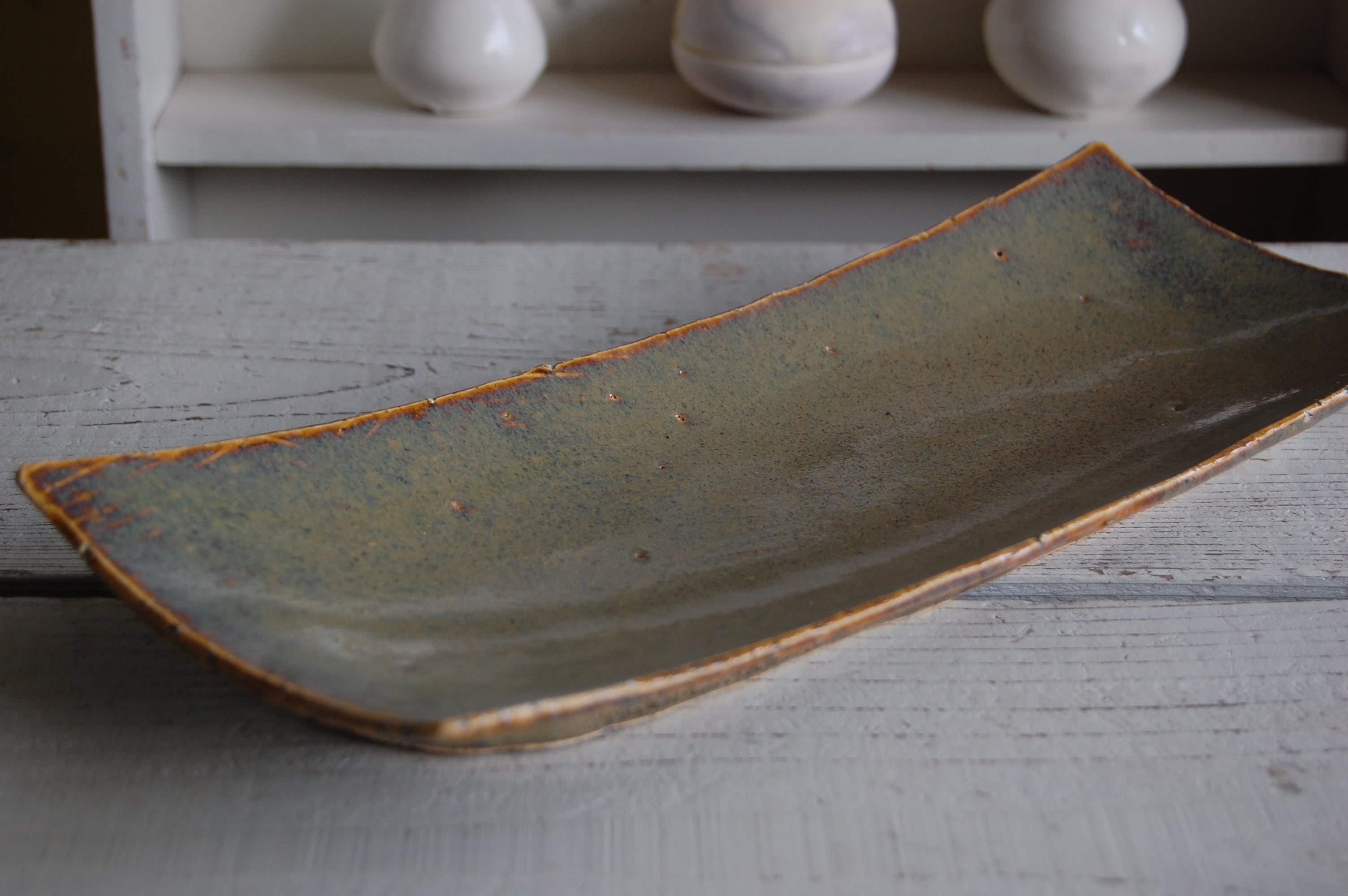 天然の木灰と僅かな鉄分で作った飴色に輝く長皿です。生地は信楽の荒土を使用していて、使い込むと器が育つ一品です。