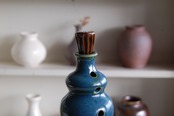 エスニックなカラーと中東の陶器の雰囲気なお香立てです。3体一体型で積み木のように組み立てて、上からお香を差してつかいます。煙が比重により穴から吹き出して、幻想的な作品です。