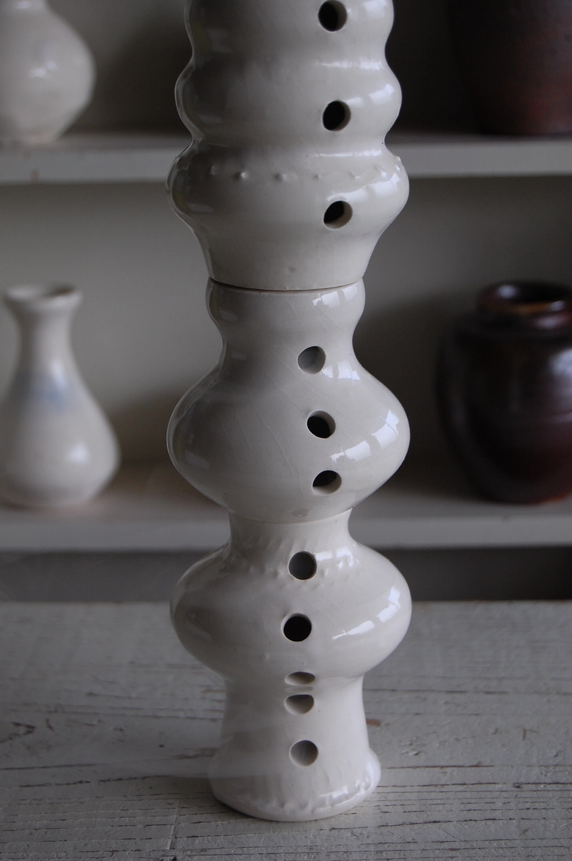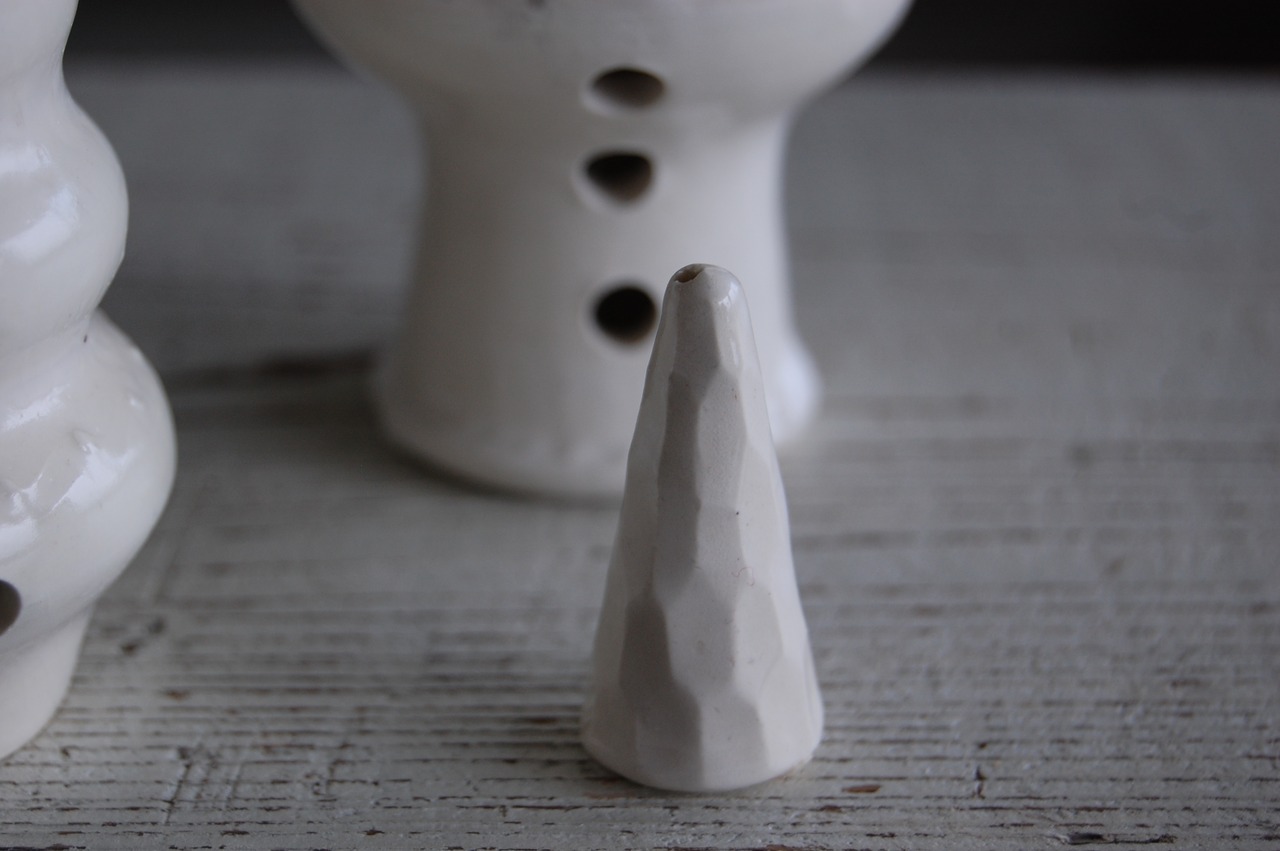 3体一体型で積み木のように組み立てて、上からお香を差してつかいます。煙が比重により穴から吹き出して、幻想的な作品です。