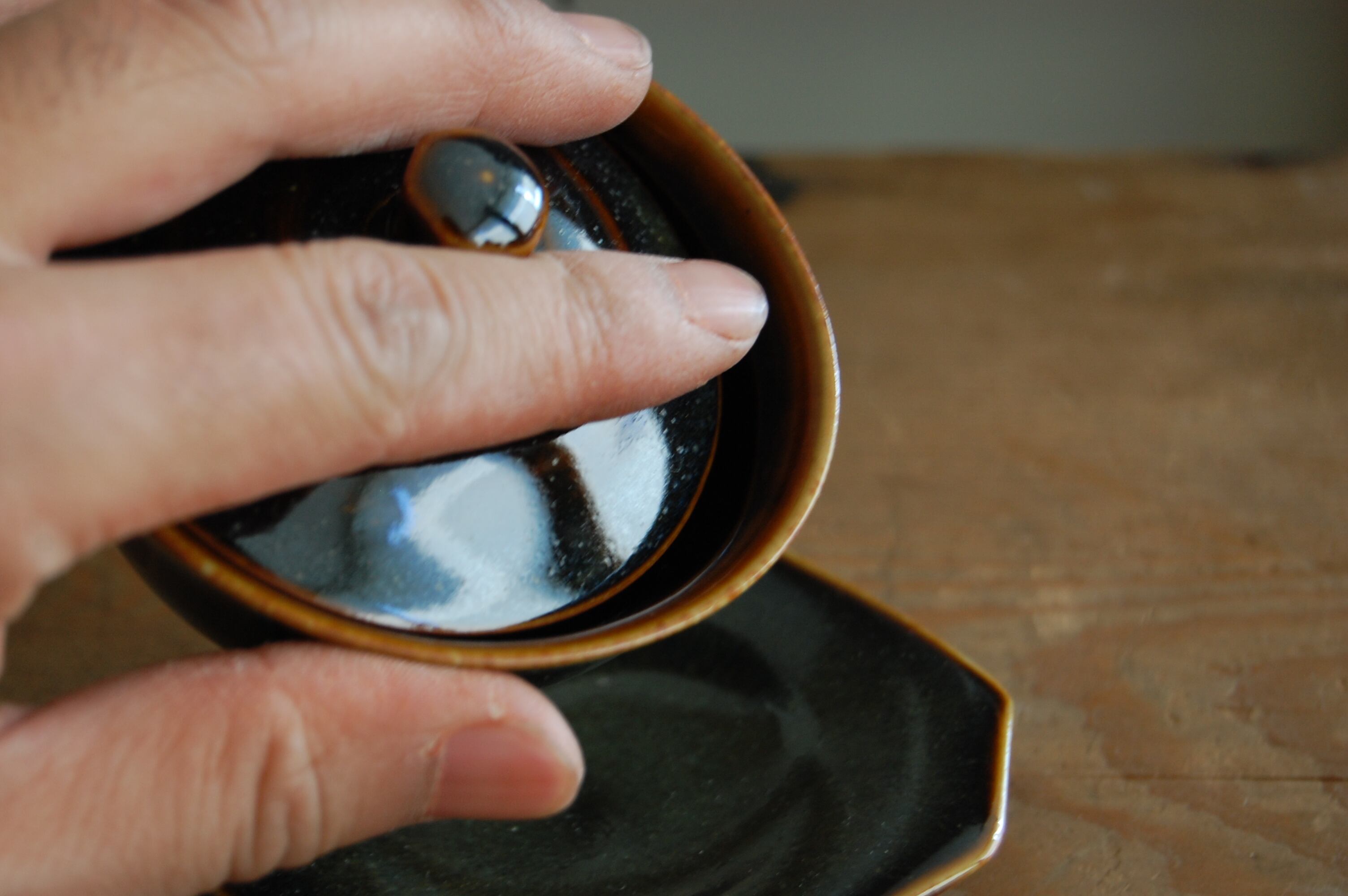 松の灰で作った天然の飴釉薬に、萬古焼の急須に使われるキメ細かな赤土に施し焼き上げました。
